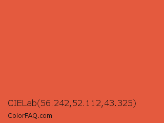 CIELab 56.242,52.112,43.325 Color is a normal red color and the nearest color is Flame Pea #da5b38. Hex code #e45a3e and RGB value is rgb(228,90,62). In RGB color space, this color is composed of 89% red, 35% green, 24% blue, In CMYK color space, this color is composed of 0% cyan, 61% magenta, 73% yellow , 11% black , In HSL color space, this color has a hue angle of 10° , 75% saturation and 57% lightness.