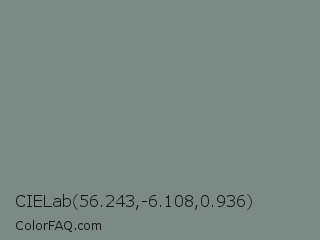CIELab 56.243,-6.108,0.936 Color is a normal green color and the nearest color is Gunsmoke #828685. Hex code #7c8a85 and RGB value is rgb(124,138,133). In RGB color space, this color is composed of 49% red, 54% green, 52% blue, In CMYK color space, this color is composed of 10% cyan, 0% magenta, 4% yellow , 46% black , In HSL color space, this color has a hue angle of 159° , 6% saturation and 51% lightness.