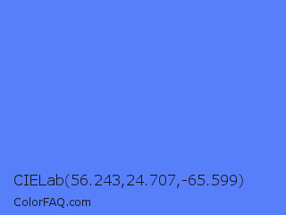 CIELab 56.243,24.707,-65.599 Color is a light blue color and the nearest color is Blueberry #4f86f7. Hex code #587ffa and RGB value is rgb(88,127,250). In RGB color space, this color is composed of 35% red, 50% green, 98% blue, In CMYK color space, this color is composed of 65% cyan, 49% magenta, 0% yellow , 2% black , In HSL color space, this color has a hue angle of 226° , 94% saturation and 66% lightness.