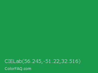 CIELab 56.245,-51.22,32.516 Color is a normal green color and the nearest color is Eucalyptus #278a5b. Hex code #199b4b and RGB value is rgb(25,155,75). In RGB color space, this color is composed of 10% red, 61% green, 29% blue, In CMYK color space, this color is composed of 84% cyan, 0% magenta, 52% yellow , 39% black , In HSL color space, this color has a hue angle of 143° , 72% saturation and 35% lightness.