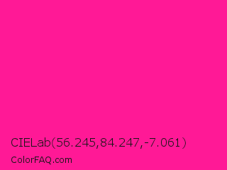 CIELab 56.245,84.247,-7.061 Color is a normal magenta color and the nearest color is Fluorescent Pink #ff1493. Hex code #ff1996 and RGB value is rgb(255,25,150). In RGB color space, this color is composed of 100% red, 10% green, 59% blue, In CMYK color space, this color is composed of 0% cyan, 90% magenta, 41% yellow , 0% black , In HSL color space, this color has a hue angle of 327° , 100% saturation and 55% lightness.