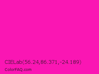 CIELab 56.24,86.371,-24.189 Color is a normal magenta color and the nearest color is Shocking Pink #fc0fc0. Hex code #fa16b3 and RGB value is rgb(250,22,179). In RGB color space, this color is composed of 98% red, 9% green, 70% blue, In CMYK color space, this color is composed of 0% cyan, 91% magenta, 28% yellow , 2% black , In HSL color space, this color has a hue angle of 319° , 96% saturation and 53% lightness.