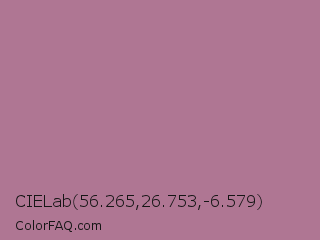 CIELab 56.265,26.753,-6.579 Color is a normal rose color and the nearest color is English Lavender #b48395. Hex code #af7693 and RGB value is rgb(175,118,147). In RGB color space, this color is composed of 69% red, 46% green, 58% blue, In CMYK color space, this color is composed of 0% cyan, 33% magenta, 16% yellow , 31% black , In HSL color space, this color has a hue angle of 329° , 26% saturation and 57% lightness.