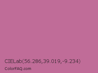 CIELab 56.286,39.019,-9.234 Color is a normal rose color and the nearest color is Pearly Purple #b768a2. Hex code #c06c98 and RGB value is rgb(192,108,152). In RGB color space, this color is composed of 75% red, 42% green, 60% blue, In CMYK color space, this color is composed of 0% cyan, 44% magenta, 21% yellow , 25% black , In HSL color space, this color has a hue angle of 329° , 40% saturation and 59% lightness.
