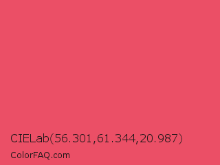 CIELab 56.301,61.344,20.987 Color is a light red color and the nearest color is Mandy #e25465. Hex code #eb4f66 and RGB value is rgb(235,79,102). In RGB color space, this color is composed of 92% red, 31% green, 40% blue, In CMYK color space, this color is composed of 0% cyan, 66% magenta, 57% yellow , 8% black , In HSL color space, this color has a hue angle of 351° , 80% saturation and 62% lightness.