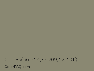 CIELab 56.314,-3.209,12.101 Color is a normal yellow color and the nearest color is Granite Green #8d8974. Hex code #8a8872 and RGB value is rgb(138,136,114). In RGB color space, this color is composed of 54% red, 53% green, 45% blue, In CMYK color space, this color is composed of 0% cyan, 1% magenta, 17% yellow , 46% black , In HSL color space, this color has a hue angle of 55° , 10% saturation and 49% lightness.