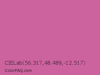 CIELab 56.317,48.489,-12.517 Color is a normal magenta color and the nearest color is Hopbush #d06da1. Hex code #cc639e and RGB value is rgb(204,99,158). In RGB color space, this color is composed of 80% red, 39% green, 62% blue, In CMYK color space, this color is composed of 0% cyan, 51% magenta, 23% yellow , 20% black , In HSL color space, this color has a hue angle of 326° , 51% saturation and 59% lightness.
