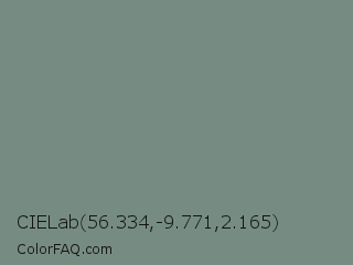 CIELab 56.334,-9.771,2.165 Color is a normal green color and the nearest color is Blue Smoke #748881. Hex code #768c83 and RGB value is rgb(118,140,131). In RGB color space, this color is composed of 46% red, 55% green, 51% blue, In CMYK color space, this color is composed of 16% cyan, 0% magenta, 6% yellow , 45% black , In HSL color space, this color has a hue angle of 155° , 9% saturation and 51% lightness.