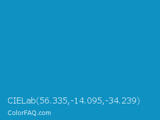CIELab 56.335,-14.095,-34.239 Color is a normal blue color and the nearest color is Cyan Cornflower Blue #188bc2. Hex code #0f91c2 and RGB value is rgb(15,145,194). In RGB color space, this color is composed of 6% red, 57% green, 76% blue, In CMYK color space, this color is composed of 92% cyan, 25% magenta, 0% yellow , 24% black , In HSL color space, this color has a hue angle of 196° , 86% saturation and 41% lightness.
