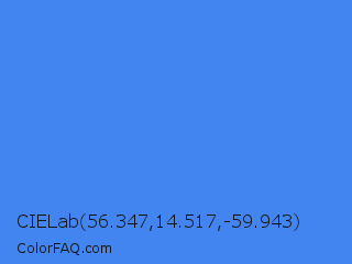CIELab 56.347,14.517,-59.943 Color is a normal blue color and the nearest color is Blueberry #4f86f7. Hex code #4385f0 and RGB value is rgb(67,133,240). In RGB color space, this color is composed of 26% red, 52% green, 94% blue, In CMYK color space, this color is composed of 72% cyan, 45% magenta, 0% yellow , 6% black , In HSL color space, this color has a hue angle of 217° , 85% saturation and 60% lightness.
