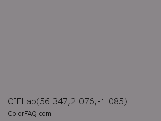 CIELab 56.347,2.076,-1.085 Color is a normal magenta color and the nearest color is Taupe Gray #8b8589. Hex code #8a8689 and RGB value is rgb(138,134,137). In RGB color space, this color is composed of 54% red, 53% green, 54% blue, In CMYK color space, this color is composed of 0% cyan, 3% magenta, 1% yellow , 46% black , In HSL color space, this color has a hue angle of 315° , 2% saturation and 53% lightness.