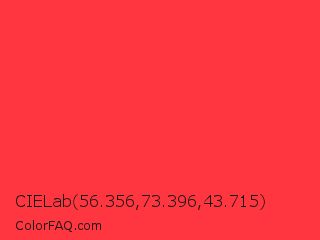 CIELab 56.356,73.396,43.715 Color is a light red color and the nearest color is Coral Red #ff4040. Hex code #ff3640 and RGB value is rgb(255,54,64). In RGB color space, this color is composed of 100% red, 21% green, 25% blue, In CMYK color space, this color is composed of 0% cyan, 79% magenta, 75% yellow , 0% black , In HSL color space, this color has a hue angle of 357° , 100% saturation and 61% lightness.