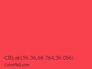 CIELab 56.36,68.764,36.066 Color is a light red color and the nearest color is Sunburnt Cyclops #ff404c. Hex code #f8414d and RGB value is rgb(248,65,77). In RGB color space, this color is composed of 97% red, 25% green, 30% blue, In CMYK color space, this color is composed of 0% cyan, 74% magenta, 69% yellow , 3% black , In HSL color space, this color has a hue angle of 356° , 93% saturation and 61% lightness.
