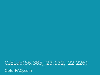 CIELab 56.385,-23.132,-22.226 Color is a normal cyan color and the nearest color is Blue Green #0d98ba. Hex code #0f94ad and RGB value is rgb(15,148,173). In RGB color space, this color is composed of 6% red, 58% green, 68% blue, In CMYK color space, this color is composed of 91% cyan, 14% magenta, 0% yellow , 32% black , In HSL color space, this color has a hue angle of 189° , 84% saturation and 37% lightness.