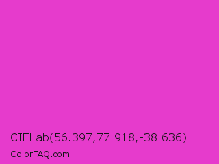 CIELab 56.397,77.918,-38.636 Color is a normal magenta color and the nearest color is Razzle Dazzle Rose #ff33cc. Hex code #e63bcc and RGB value is rgb(230,59,204). In RGB color space, this color is composed of 90% red, 23% green, 80% blue, In CMYK color space, this color is composed of 0% cyan, 74% magenta, 11% yellow , 10% black , In HSL color space, this color has a hue angle of 309° , 77% saturation and 57% lightness.