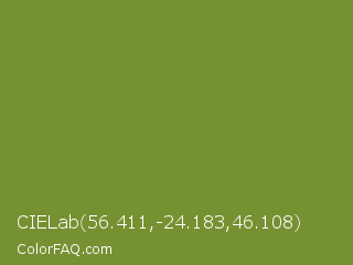 CIELab 56.411,-24.183,46.108 Color is a normal lime color and the nearest color is Wasabi #788a25. Hex code #769131 and RGB value is rgb(118,145,49). In RGB color space, this color is composed of 46% red, 57% green, 19% blue, In CMYK color space, this color is composed of 19% cyan, 0% magenta, 66% yellow , 43% black , In HSL color space, this color has a hue angle of 77° , 49% saturation and 38% lightness.