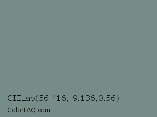 CIELab 56.416,-9.136,0.56 Color is a normal cyan color and the nearest color is Blue Smoke #748881. Hex code #768c86 and RGB value is rgb(118,140,134). In RGB color space, this color is composed of 46% red, 55% green, 53% blue, In CMYK color space, this color is composed of 16% cyan, 0% magenta, 4% yellow , 45% black , In HSL color space, this color has a hue angle of 164° , 9% saturation and 51% lightness.