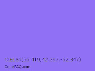 CIELab 56.419,42.397,-62.347 Color is a light indigo color and the nearest color is Medium Slate Blue #7b68ee. Hex code #9071f5 and RGB value is rgb(144,113,245). In RGB color space, this color is composed of 56% red, 44% green, 96% blue, In CMYK color space, this color is composed of 41% cyan, 54% magenta, 0% yellow , 4% black , In HSL color space, this color has a hue angle of 254° , 87% saturation and 70% lightness.