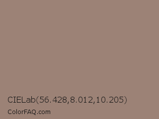 CIELab 56.428,8.012,10.205 Color is a normal orange color and the nearest color is Cinereous #98817b. Hex code #9c8276 and RGB value is rgb(156,130,118). In RGB color space, this color is composed of 61% red, 51% green, 46% blue, In CMYK color space, this color is composed of 0% cyan, 17% magenta, 24% yellow , 39% black , In HSL color space, this color has a hue angle of 19° , 16% saturation and 54% lightness.