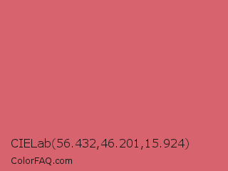 CIELab 56.432,46.201,15.924 Color is a light red color and the nearest color is Fuzzy Wuzzy #cc6666. Hex code #d6636e and RGB value is rgb(214,99,110). In RGB color space, this color is composed of 84% red, 39% green, 43% blue, In CMYK color space, this color is composed of 0% cyan, 54% magenta, 49% yellow , 16% black , In HSL color space, this color has a hue angle of 354° , 58% saturation and 61% lightness.