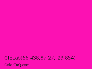 CIELab 56.438,87.27,-23.854 Color is a normal magenta color and the nearest color is Shocking Pink #fc0fc0. Hex code #fc11b3 and RGB value is rgb(252,17,179). In RGB color space, this color is composed of 99% red, 7% green, 70% blue, In CMYK color space, this color is composed of 0% cyan, 93% magenta, 29% yellow , 1% black , In HSL color space, this color has a hue angle of 319° , 98% saturation and 53% lightness.