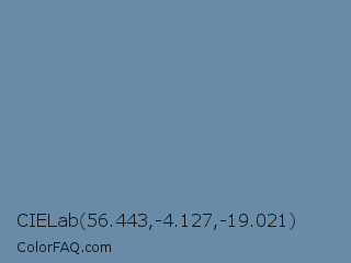 CIELab 56.443,-4.127,-19.021 Color is a normal blue color and the nearest color is Bermuda Gray #6b8ba2. Hex code #6a8ba8 and RGB value is rgb(106,139,168). In RGB color space, this color is composed of 42% red, 55% green, 66% blue, In CMYK color space, this color is composed of 37% cyan, 17% magenta, 0% yellow , 34% black , In HSL color space, this color has a hue angle of 208° , 26% saturation and 54% lightness.