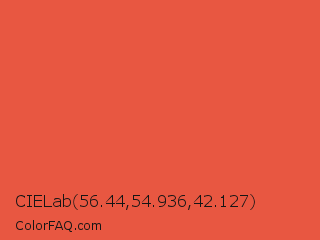 CIELab 56.44,54.936,42.127 Color is a normal red color and the nearest color is Carmine Pink #eb4c42. Hex code #e85741 and RGB value is rgb(232,87,65). In RGB color space, this color is composed of 91% red, 34% green, 25% blue, In CMYK color space, this color is composed of 0% cyan, 63% magenta, 72% yellow , 9% black , In HSL color space, this color has a hue angle of 8° , 78% saturation and 58% lightness.