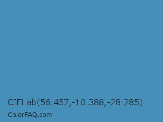 CIELab 56.457,-10.388,-28.285 Color is a normal blue color and the nearest color is Boston Blue #3b91b4. Hex code #458fb8 and RGB value is rgb(69,143,184). In RGB color space, this color is composed of 27% red, 56% green, 72% blue, In CMYK color space, this color is composed of 63% cyan, 22% magenta, 0% yellow , 28% black , In HSL color space, this color has a hue angle of 201° , 45% saturation and 50% lightness.