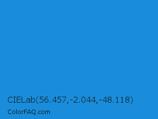 CIELab 56.457,-2.044,-48.118 Color is a normal blue color and the nearest color is Curious Blue #2596d1. Hex code #198ddb and RGB value is rgb(25,141,219). In RGB color space, this color is composed of 10% red, 55% green, 86% blue, In CMYK color space, this color is composed of 89% cyan, 36% magenta, 0% yellow , 14% black , In HSL color space, this color has a hue angle of 204° , 80% saturation and 48% lightness.