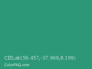 CIELab 56.457,-37.969,8.199 Color is a normal green color and the nearest color is Illuminating Emerald #319177. Hex code #2d9878 and RGB value is rgb(45,152,120). In RGB color space, this color is composed of 18% red, 60% green, 47% blue, In CMYK color space, this color is composed of 70% cyan, 0% magenta, 21% yellow , 40% black , In HSL color space, this color has a hue angle of 162° , 54% saturation and 39% lightness.