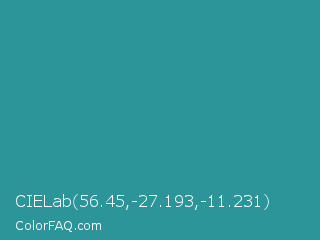 CIELab 56.45,-27.193,-11.231 Color is a normal cyan color and the nearest color is Lochinvar #2c8c84. Hex code #2c959a and RGB value is rgb(44,149,154). In RGB color space, this color is composed of 17% red, 58% green, 60% blue, In CMYK color space, this color is composed of 71% cyan, 3% magenta, 0% yellow , 40% black , In HSL color space, this color has a hue angle of 183° , 56% saturation and 39% lightness.