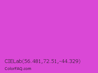 CIELab 56.481,72.51,-44.329 Color is a normal magenta color and the nearest color is Steel Pink #cc33cc. Hex code #da48d6 and RGB value is rgb(218,72,214). In RGB color space, this color is composed of 85% red, 28% green, 84% blue, In CMYK color space, this color is composed of 0% cyan, 67% magenta, 2% yellow , 15% black , In HSL color space, this color has a hue angle of 302° , 66% saturation and 57% lightness.