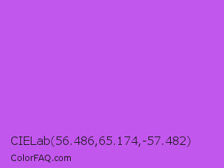 CIELab 56.486,65.174,-57.482 Color is a light purple color and the nearest color is Medium Orchid #ba55d3. Hex code #c257ed and RGB value is rgb(194,87,237). In RGB color space, this color is composed of 76% red, 34% green, 93% blue, In CMYK color space, this color is composed of 18% cyan, 63% magenta, 0% yellow , 7% black , In HSL color space, this color has a hue angle of 283° , 81% saturation and 64% lightness.