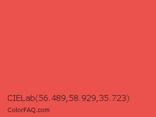 CIELab 56.489,58.929,35.723 Color is a light red color and the nearest color is Carmine Pink #eb4c42. Hex code #ec524d and RGB value is rgb(236,82,77). In RGB color space, this color is composed of 93% red, 32% green, 30% blue, In CMYK color space, this color is composed of 0% cyan, 65% magenta, 67% yellow , 7% black , In HSL color space, this color has a hue angle of 2° , 81% saturation and 61% lightness.