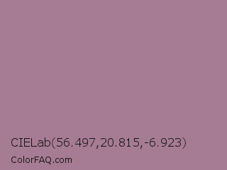 CIELab 56.497,20.815,-6.923 Color is a normal magenta color and the nearest color is Bouquet #ae809e. Hex code #a67b94 and RGB value is rgb(166,123,148). In RGB color space, this color is composed of 65% red, 48% green, 58% blue, In CMYK color space, this color is composed of 0% cyan, 26% magenta, 11% yellow , 35% black , In HSL color space, this color has a hue angle of 325° , 19% saturation and 57% lightness.