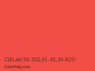 CIELab 56.502,61.45,39.825 Color is a light red color and the nearest color is Carmine Pink #eb4c42. Hex code #f04e46 and RGB value is rgb(240,78,70). In RGB color space, this color is composed of 94% red, 31% green, 27% blue, In CMYK color space, this color is composed of 0% cyan, 68% magenta, 71% yellow , 6% black , In HSL color space, this color has a hue angle of 3° , 85% saturation and 61% lightness.