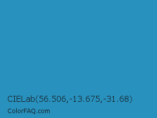 CIELab 56.506,-13.675,-31.68 Color is a normal blue color and the nearest color is Cyan Cornflower Blue #188bc2. Hex code #2891be and RGB value is rgb(40,145,190). In RGB color space, this color is composed of 16% red, 57% green, 75% blue, In CMYK color space, this color is composed of 79% cyan, 24% magenta, 0% yellow , 25% black , In HSL color space, this color has a hue angle of 198° , 65% saturation and 45% lightness.