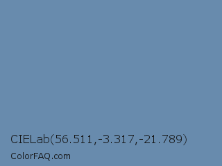 CIELab 56.511,-3.317,-21.789 Color is a normal blue color and the nearest color is Bermuda Gray #6b8ba2. Hex code #688bad and RGB value is rgb(104,139,173). In RGB color space, this color is composed of 41% red, 55% green, 68% blue, In CMYK color space, this color is composed of 40% cyan, 20% magenta, 0% yellow , 32% black , In HSL color space, this color has a hue angle of 210° , 30% saturation and 54% lightness.