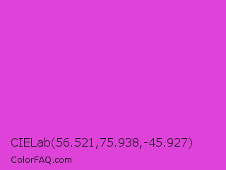 CIELab 56.521,75.938,-45.927 Color is a normal magenta color and the nearest color is Steel Pink #cc33cc. Hex code #de42d9 and RGB value is rgb(222,66,217). In RGB color space, this color is composed of 87% red, 26% green, 85% blue, In CMYK color space, this color is composed of 0% cyan, 70% magenta, 2% yellow , 13% black , In HSL color space, this color has a hue angle of 302° , 70% saturation and 56% lightness.