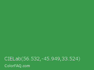 CIELab 56.532,-45.949,33.524 Color is a normal green color and the nearest color is Sea Green #2e8b57. Hex code #389a4a and RGB value is rgb(56,154,74). In RGB color space, this color is composed of 22% red, 60% green, 29% blue, In CMYK color space, this color is composed of 64% cyan, 0% magenta, 52% yellow , 40% black , In HSL color space, this color has a hue angle of 131° , 47% saturation and 41% lightness.