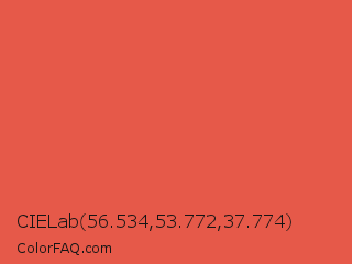 CIELab 56.534,53.772,37.774 Color is a normal red color and the nearest color is Jelly Bean #da614e. Hex code #e65949 and RGB value is rgb(230,89,73). In RGB color space, this color is composed of 90% red, 35% green, 29% blue, In CMYK color space, this color is composed of 0% cyan, 61% magenta, 68% yellow , 10% black , In HSL color space, this color has a hue angle of 6° , 76% saturation and 59% lightness.