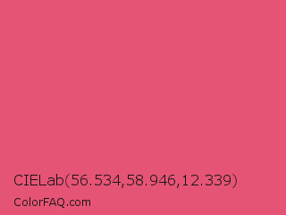 CIELab 56.534,58.946,12.339 Color is a light red color and the nearest color is Dark Pink #e75480. Hex code #e65475 and RGB value is rgb(230,84,117). In RGB color space, this color is composed of 90% red, 33% green, 46% blue, In CMYK color space, this color is composed of 0% cyan, 63% magenta, 49% yellow , 10% black , In HSL color space, this color has a hue angle of 346° , 74% saturation and 62% lightness.