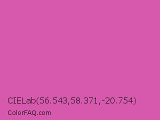 CIELab 56.543,58.371,-20.754 Color is a normal magenta color and the nearest color is Super Pink #cf6ba9. Hex code #d659ad and RGB value is rgb(214,89,173). In RGB color space, this color is composed of 84% red, 35% green, 68% blue, In CMYK color space, this color is composed of 0% cyan, 58% magenta, 19% yellow , 16% black , In HSL color space, this color has a hue angle of 320° , 60% saturation and 59% lightness.