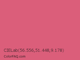 CIELab 56.556,51.448,9.178 Color is a light red color and the nearest color is Blush #de5d83. Hex code #db5e7a and RGB value is rgb(219,94,122). In RGB color space, this color is composed of 86% red, 37% green, 48% blue, In CMYK color space, this color is composed of 0% cyan, 57% magenta, 44% yellow , 14% black , In HSL color space, this color has a hue angle of 347° , 63% saturation and 61% lightness.