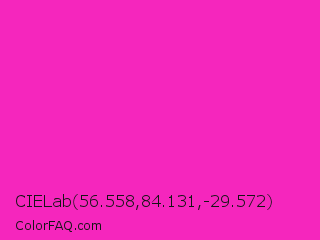 CIELab 56.558,84.131,-29.572 Color is a normal magenta color and the nearest color is Hot Magenta #ff1dce. Hex code #f526bd and RGB value is rgb(245,38,189). In RGB color space, this color is composed of 96% red, 15% green, 74% blue, In CMYK color space, this color is composed of 0% cyan, 84% magenta, 23% yellow , 4% black , In HSL color space, this color has a hue angle of 316° , 91% saturation and 55% lightness.