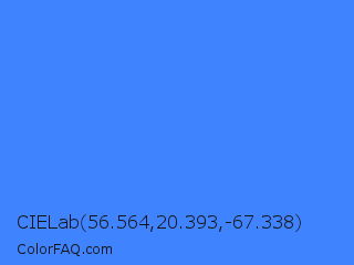 CIELab 56.564,20.393,-67.338 Color is a light blue color and the nearest color is Blueberry #4f86f7. Hex code #4083fe and RGB value is rgb(64,131,254). In RGB color space, this color is composed of 25% red, 51% green, 100% blue, In CMYK color space, this color is composed of 75% cyan, 48% magenta, 0% yellow , 0% black , In HSL color space, this color has a hue angle of 219° , 99% saturation and 62% lightness.