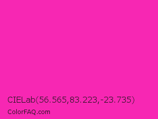 CIELab 56.565,83.223,-23.735 Color is a normal magenta color and the nearest color is Persian Rose #fe28a2. Hex code #f727b3 and RGB value is rgb(247,39,179). In RGB color space, this color is composed of 97% red, 15% green, 70% blue, In CMYK color space, this color is composed of 0% cyan, 84% magenta, 28% yellow , 3% black , In HSL color space, this color has a hue angle of 320° , 93% saturation and 56% lightness.