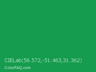 CIELab 56.572,-51.463,31.362 Color is a normal green color and the nearest color is Green Pigment #00a550. Hex code #159c4e and RGB value is rgb(21,156,78). In RGB color space, this color is composed of 8% red, 61% green, 31% blue, In CMYK color space, this color is composed of 87% cyan, 0% magenta, 50% yellow , 39% black , In HSL color space, this color has a hue angle of 145° , 76% saturation and 35% lightness.