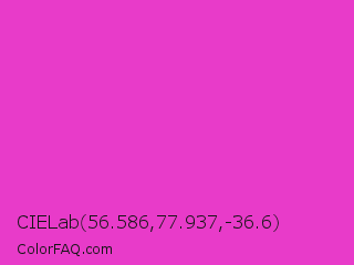 CIELab 56.586,77.937,-36.6 Color is a normal magenta color and the nearest color is Razzle Dazzle Rose #ff33cc. Hex code #e83bc9 and RGB value is rgb(232,59,201). In RGB color space, this color is composed of 91% red, 23% green, 79% blue, In CMYK color space, this color is composed of 0% cyan, 75% magenta, 13% yellow , 9% black , In HSL color space, this color has a hue angle of 311° , 79% saturation and 57% lightness.