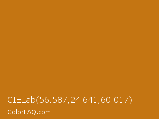 CIELab 56.587,24.641,60.017 Color is a normal orange color and the nearest color is Meteor #d07d12. Hex code #c47512 and RGB value is rgb(196,117,18). In RGB color space, this color is composed of 77% red, 46% green, 7% blue, In CMYK color space, this color is composed of 0% cyan, 40% magenta, 91% yellow , 23% black , In HSL color space, this color has a hue angle of 33° , 83% saturation and 42% lightness.